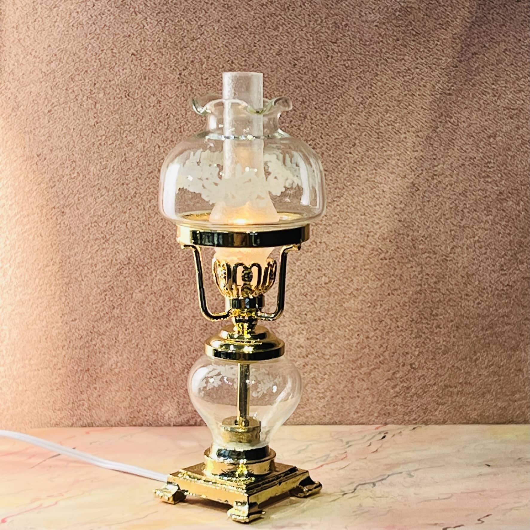 Elegant messing og glas bordlampe til petroleum. Dukkehus lampe til fine dukkehuse