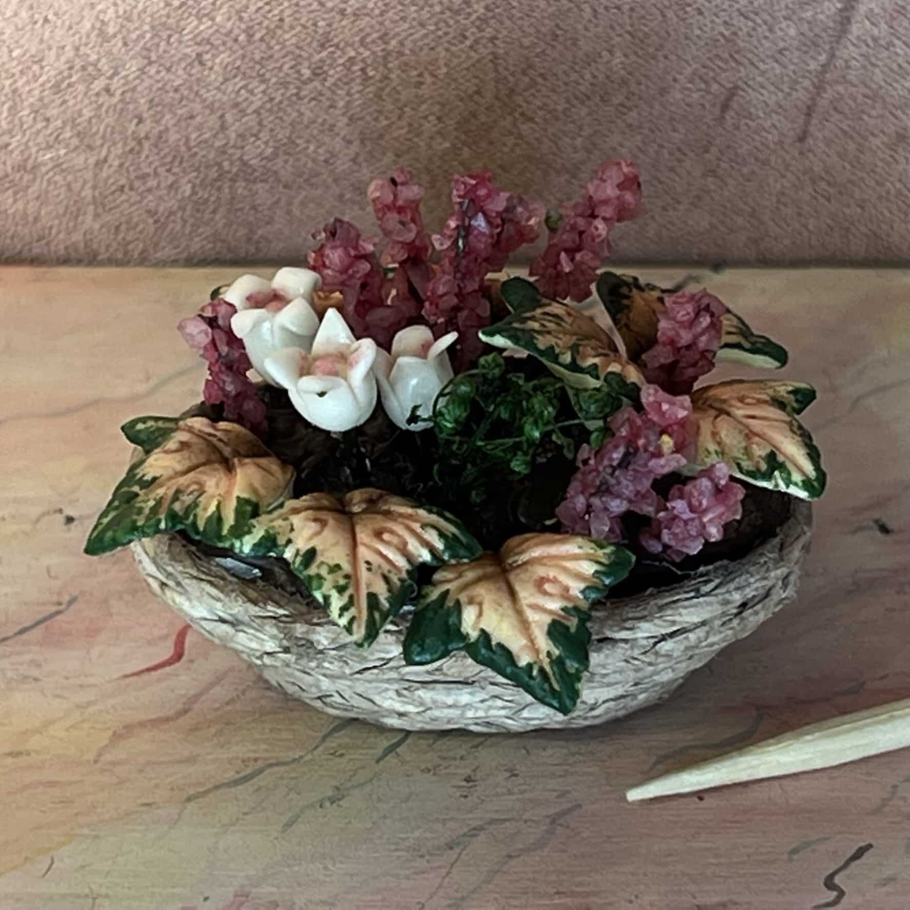 Dukkehus sammenplant i kurv til dukkehus 1:12