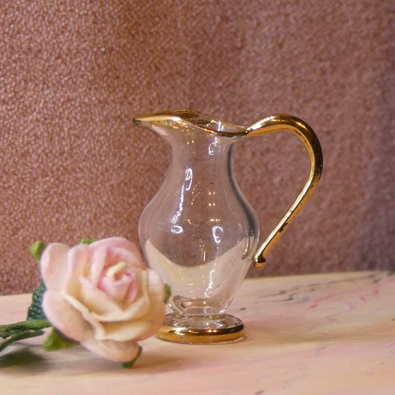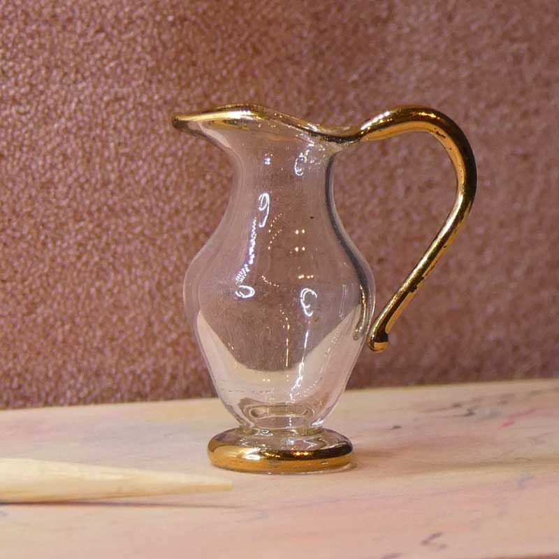 Lille glaskande i rigtig sød og elegant form. Den måler kun 17 mm i højden og 15 mm i bredden incl. hanken. Faktisk er denne saftkande så lille at den også kan bruges i Lundby dukkehuse.