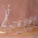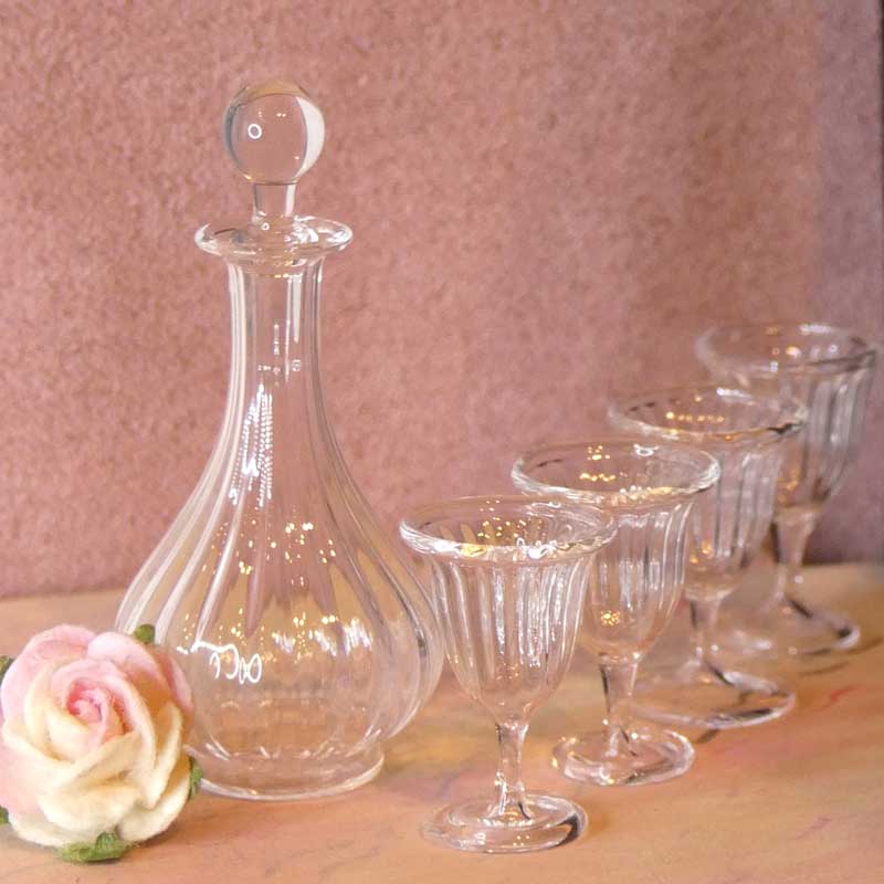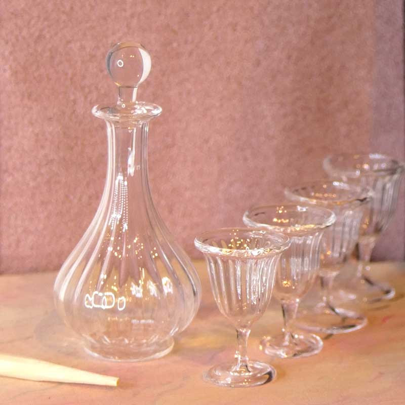 Miniature glas karaffel og 4 vinglas – smukt håndlavet glas i miniature 1:12