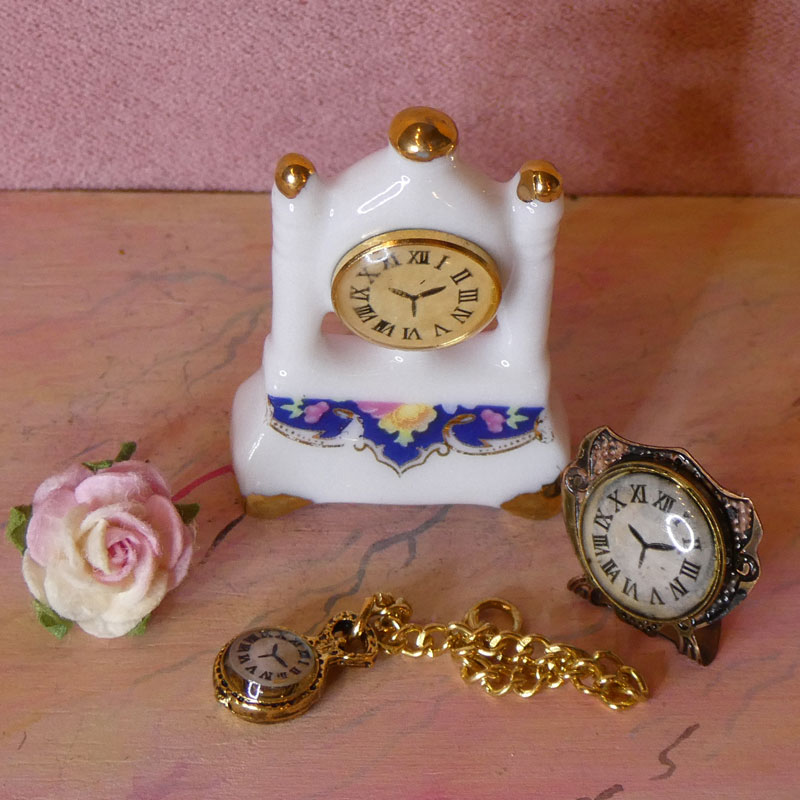 Et rigtig fint sæt med ure til dukkehuset, som vanligvis flot og detaljeret udført i tysk kvalitet fra Reutters Porcelæn.